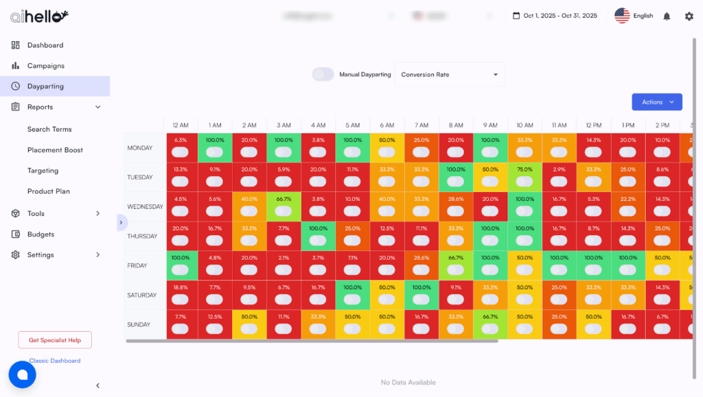 Picture a grid: hours of the day on the X, days on the Y. Green = high conversion, red = low. AiHello translates this map into automated campaign actions, so your highest bids always match your highest revenue windows.