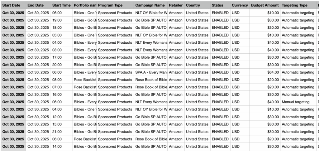 - Impressions, clicks, and orders by hour and day from Amazon’s reports or your analytics software